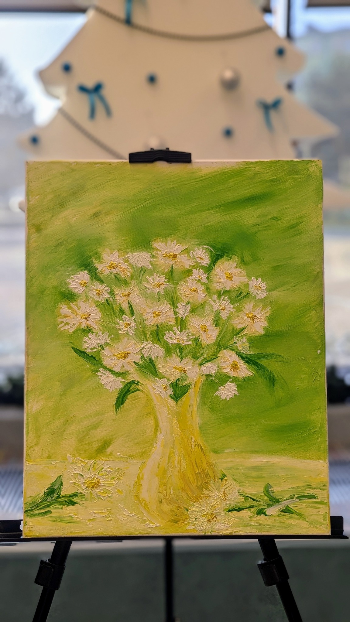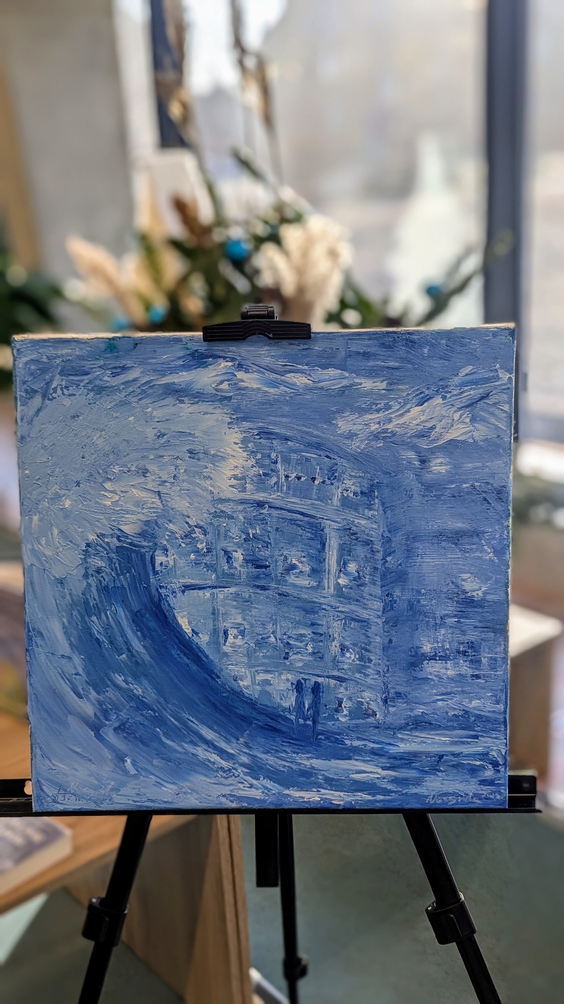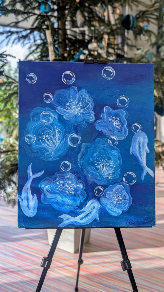Emilia maluje głównie farbami olejnymi i szpachlą, tworząc wyjątkowe pejzaże oraz portrety pełne światła i emocji. Kolory jej obrazów idealnie wpisują się w turkusowy nastrój wnętrza Biblioteki, tworząc atmosferę spokoju i inspiracji.