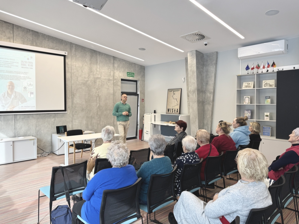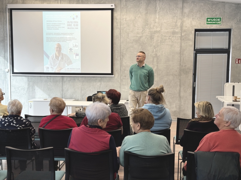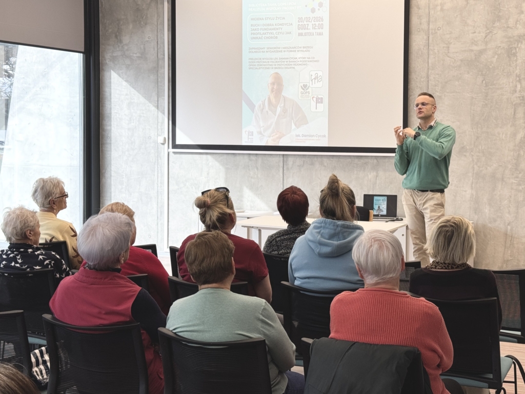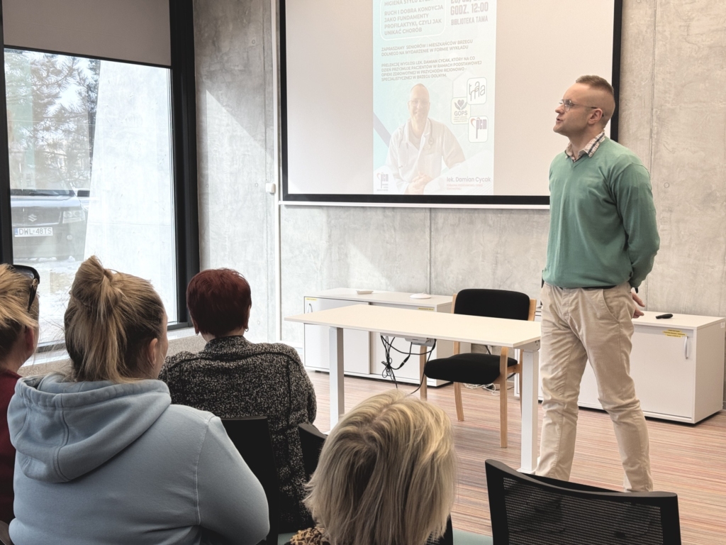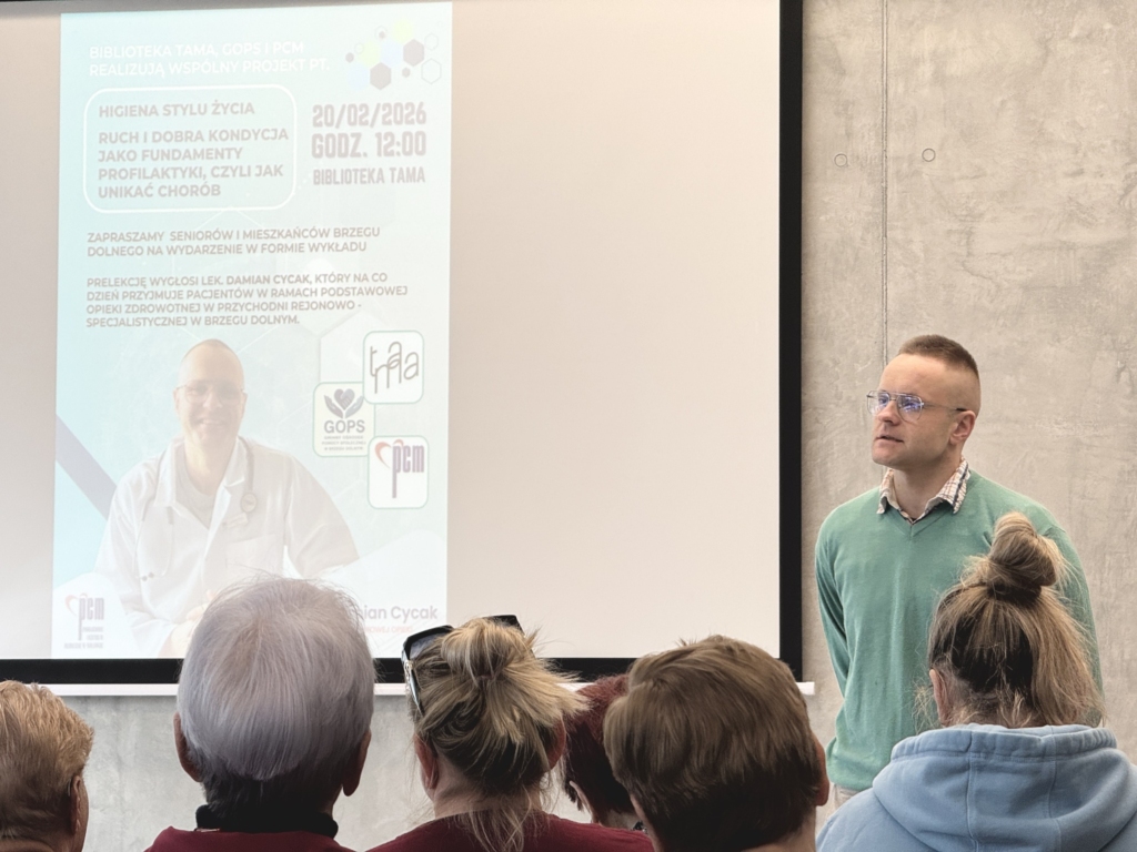 Dziś w Bibliotece TAMA w Brzegu Dolnym seniorzy wysłuchali wykładu lek. Damiana Cycaka o higienie stylu życia i roli ruchu w profilaktyce, który podkreślił aktywność fizyczną, zdrowe odżywianie, szczepienia, antybiotykooporność i program „Moje Zdrowie”.